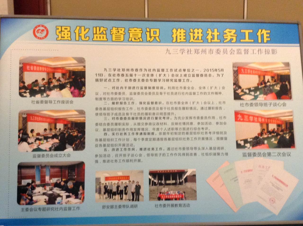 社鄭州市委認真總結社內監(jiān)督工作經驗,為大會提交了“強化監(jiān)督措施 促進社務工作”的大會發(fā)言交流材料、監(jiān)督工作展板、社訊、履職報告、文件匯編等,二七區(qū)基層委員會主委張祖勤作為基層代表進行大會發(fā)言。
