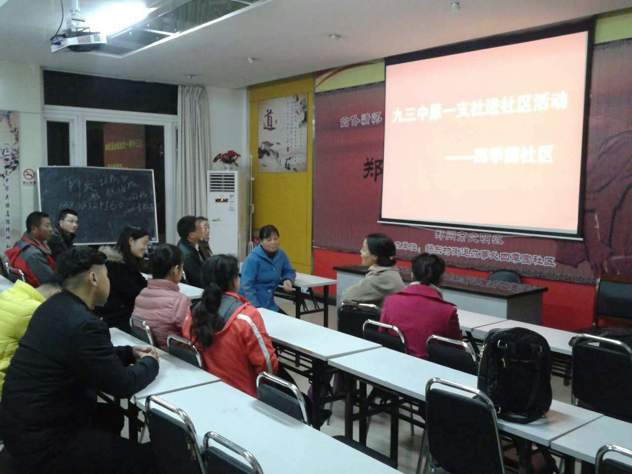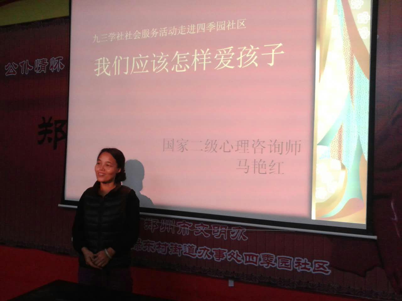 11月20日,九三學(xué)社中原一支社走進(jìn)中原區(qū)綠東村四季園社區(qū)開展社會服務(wù)活動。社區(qū)志愿者、國家二級心理咨詢師、支社主委馬艷紅為轄區(qū)居民、社區(qū)工作者和九三社員做了“怎樣和孩子溝通更有效” 的親子教育專題講座,開展了游戲互動,現(xiàn)場解答了問題,得到了大家的一致好評。