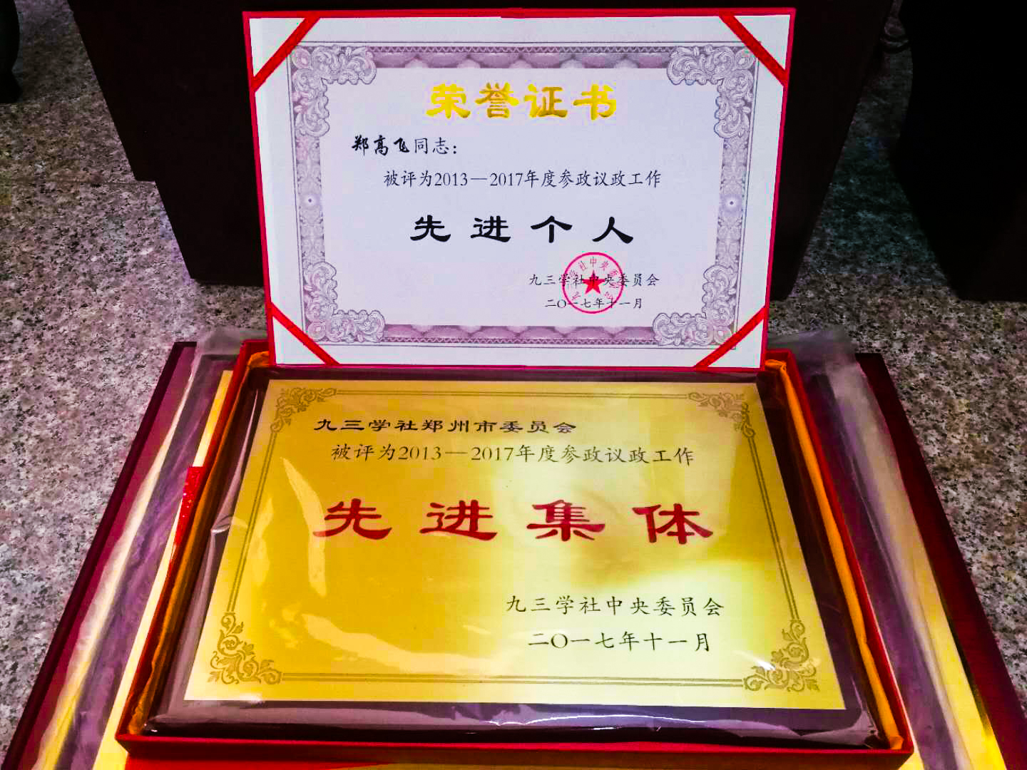 九三學(xué)社鄭州市委榮獲社中央“2013-2017年度參政議政先進(jìn)集體”、社市委主委鄭高飛榮獲社中央“2013-2017年度參政議政先進(jìn)個(gè)人”。