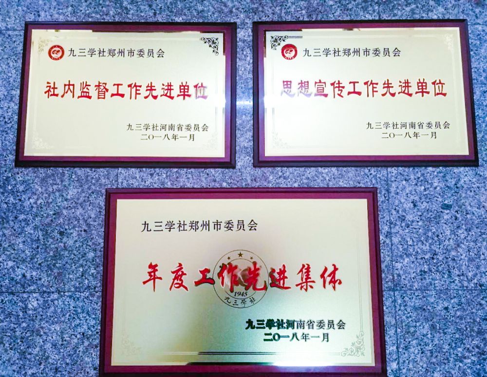 九三學(xué)社鄭州市委獲社省委年度工作先進(jìn)集體、思想宣傳工作先進(jìn)單位、參政議政工作先進(jìn)單位、社內(nèi)監(jiān)督工作先進(jìn)單位。社員魏三多獲宣傳工作先進(jìn)個(gè)人、黃萬新、劉三軍獲社會(huì)服務(wù)工作先進(jìn)個(gè)人、尚秋霞獲社內(nèi)監(jiān)督工作先進(jìn)個(gè)人和機(jī)關(guān)建設(shè)工作先進(jìn)個(gè)人。