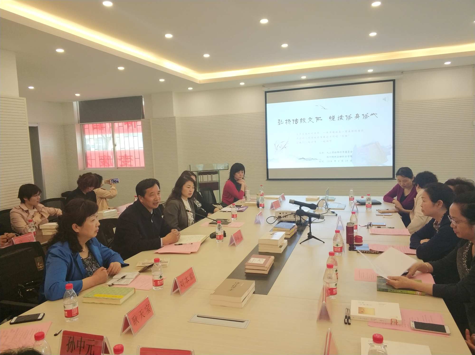 4月19日上午,由九三學(xué)社鄭州市委主辦、九三學(xué)社鄭州市教育文化委員會(huì)與參政議政工作委員會(huì)聯(lián)合承辦的“弘揚(yáng)傳統(tǒng)文化 悅讀修身修心”讀書(shū)活動(dòng)在鄭州財(cái)稅金融職業(yè)學(xué)院舉辦。社市委主委鄭高飛、專(zhuān)職副主委何艷麗出席本次活動(dòng)。社市委委員、鄭州財(cái)稅金融職業(yè)學(xué)院圖書(shū)館館長(zhǎng)杜瑞峰主持活動(dòng)。