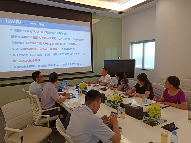 調研組一行實地了解了潼湖科技小鎮(zhèn)規(guī)劃建設情況,并召開了調研座談會。座談中,潼湖科技小鎮(zhèn)發(fā)展事業(yè)部項目負責人陳新勝、信息管理中心項目管理總監(jiān)朱細龍分別介紹了潼湖小鎮(zhèn)智慧城市規(guī)劃建設和發(fā)展情況,并就調研組提出的問題進行詳細解答。