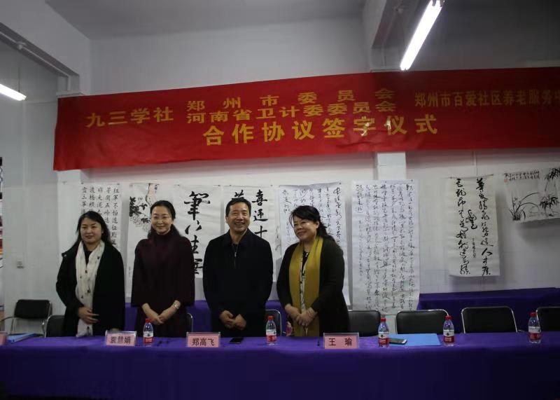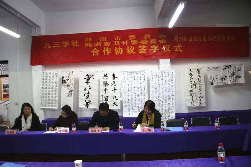 鄭高飛、袁慧娟、王瑜作為三方代表簽署合作協議。經過考察,在九三學社鄭州市委員會與九三學社河南省衛(wèi)計委委員會簽訂結對子框架協議的基礎上,以鄭州市管城回族區(qū)百愛社區(qū)養(yǎng)老服務中心為首批合作單位,三方簽訂合作協議,搭建合作平臺,組織專家開展醫(yī)療人才培養(yǎng)、診療能力提升合作,為老人提供健康服務。同時,積極探索參政黨社會服務的有效途徑,為鄭州國家中心城市建設獻計出力,共創(chuàng)九三學社社會服務的良好品牌。