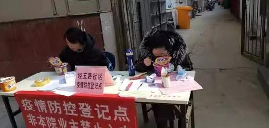 在卡點值班的時候,潘華負責進出人員測體溫、登記的工作,并入戶排查疫區(qū)返鄭人員,將情況告知社區(qū),由社區(qū)進行隔離措施。每天早上八點半之前,潘華就到達卡點開始值守工作,在寒風中一待就是一天,身上都凍透了。即使穿上護膝,毛背心,身上腳底貼上暖寶寶,也支撐不了太長時間,只能來回跑跑增加點熱量。由于室外溫度太低,紅外線體溫槍有時不能正常使用,只能放在腋下暖著才能用。為了盡量不遠離崗位,一天下來她都不敢多喝水,午餐時間也是在崗位上草草地吃份泡面就解決了。由于長時間佩戴口罩,潘華的臉也因過敏而紅腫起來。