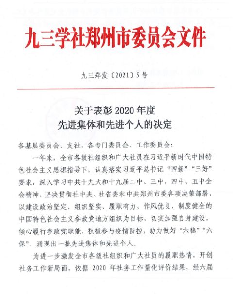 2月3日,九三學(xué)社鄭州市委在六屆十四次全體(擴(kuò)大)會(huì)議上,對(duì)2020年度社務(wù)工作中表現(xiàn)突出的20個(gè)先進(jìn)集體和86名先進(jìn)個(gè)人進(jìn)行了表彰。