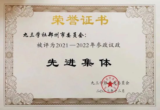 九三學社鄭州市委會獲“九三學社中央2021-2022年參政議政先進集體”,獲九三學社河南省委會“年度工作先進集體”“思想宣傳工作先進單位”“參政議政工作先進單位”“組織建設工作先進單位”等多項榮譽稱號。