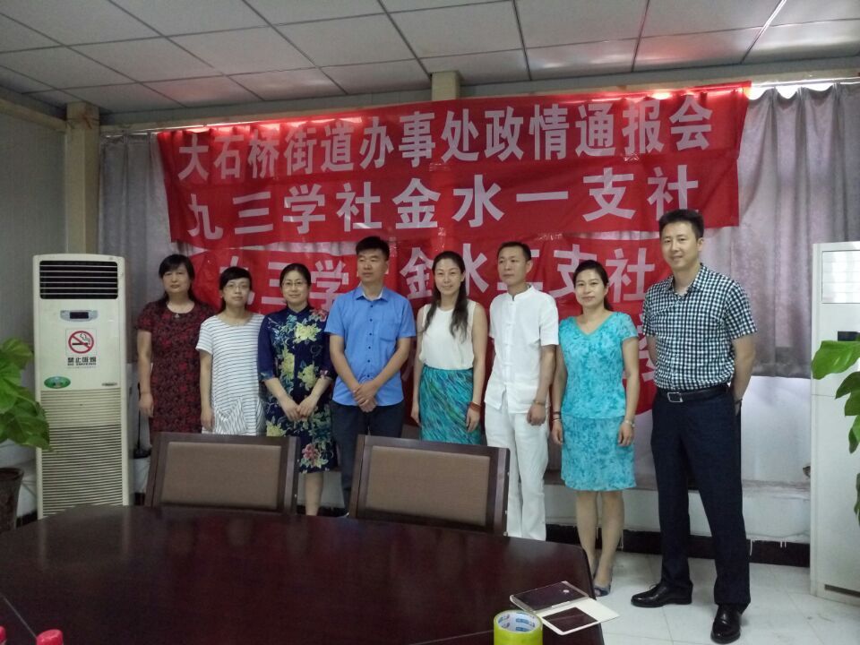 6月29日上午, 九三學(xué)社金水一支社與大石橋街道黨工委結(jié)對(duì)共建,在大石橋辦事處八樓會(huì)議室舉行政情通報(bào)會(huì)活動(dòng)。九三學(xué)社金水基層委員會(huì)主委張根山,一支社主委梁俊麗、副主委段學(xué)哲、石華,大石橋街道黨工委副書(shū)記呂馨、黨工委統(tǒng)戰(zhàn)委員蘆勇參加此次活動(dòng)。