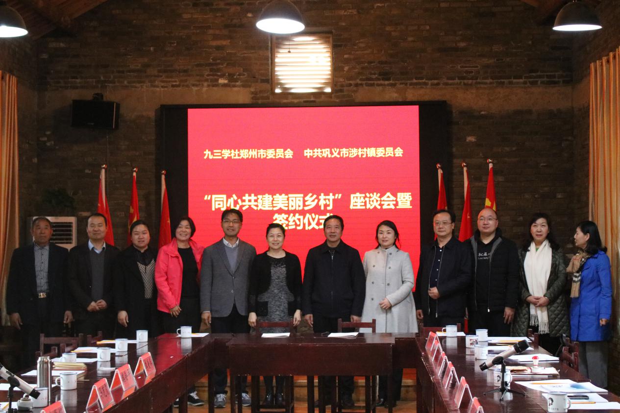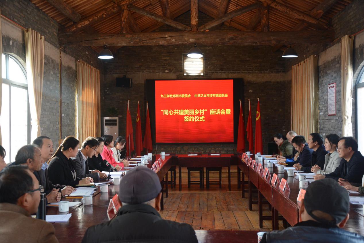 11月28日下午,九三學社鄭州市委員會與中共鞏義市涉村鎮(zhèn)委員會 “同心共建美麗鄉(xiāng)村”座談會暨簽約儀式在涉村鎮(zhèn)石居部落創(chuàng)客公社會議室舉行。九三學社鄭州市委主委鄭高飛、專職副主委何艷麗,九三學社河南省農(nóng)科院委員會秘書長喬奇,涉村鎮(zhèn)黨委書記許學輝、副書記蔡攀參加。鞏義市政協(xié)副主席馬克霞,中共鞏義市委統(tǒng)戰(zhàn)部常務(wù)副部長魏會平應(yīng)邀出席。會議由許學輝主持。