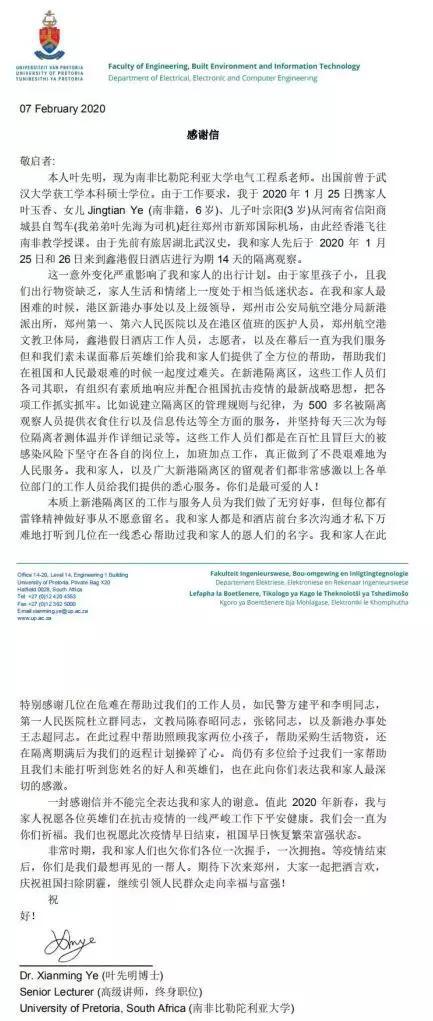 南非華人葉先明博士(現(xiàn)為南非比勒陀利亞大學(xué)電氣工程系高級講師)及家人在航空港鑫港假日酒店進(jìn)行14天的隔離觀察。期間,疫情防控工作人員的專業(yè)素養(yǎng)得到葉博士的贊許,在寫給鄭州航空港經(jīng)濟(jì)綜合實驗區(qū)的感謝信里,他飽含真情地這樣表達(dá):“各司其職,有組織有素質(zhì)地響應(yīng)并配合祖國抗擊疫情的最新戰(zhàn)略思想,把各項工作抓實抓牢。比如說建立隔離區(qū)的管理規(guī)則與紀(jì)律,為隔離觀察人員提供衣食住行及信息傳達(dá)等全方面服務(wù),堅持每天三次為隔離者測體溫并作詳細(xì)記錄等……” “我們多次溝通,才打聽到幾位幫助過我們的恩人的名字,他們是方建平、李明、杜立群、……還有好多沒有打聽到名字,他們冒著巨大風(fēng)險堅守在崗位上,不畏艱難地為人民服務(wù),大家都非常感激!” “我們會一直為他們祈福,祝愿疫情早日結(jié)束,期待下次來鄭州,大家一起把酒言歡慶祝祖國掃除陰霾,繼續(xù)引領(lǐng)人民群眾走向幸福與富強!”