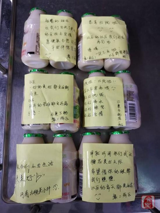 長時間的隔離治療和封閉的環(huán)境讓這些輕癥患者們有些壓力,關(guān)注到這種情況后,張勤生和醫(yī)療隊成員就每天帶著大伙兒練八段錦、太極拳,疏導(dǎo)他們的情緒。治療的過程中也發(fā)生了不少讓張勤生感到溫暖的小事。“病人看到我們特別興奮,要跟我們合影,包括今天出院的病人,我們護(hù)理人員都給他們帶了酸奶,上面貼了很溫馨的話。”
